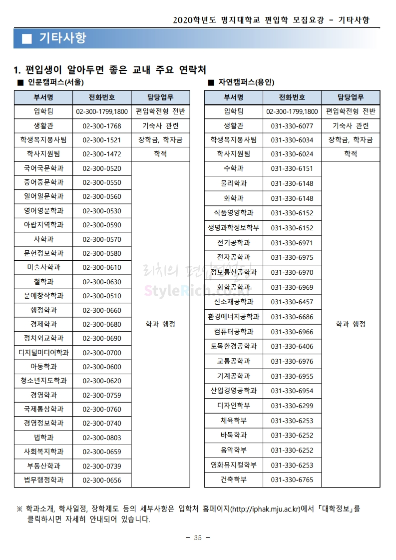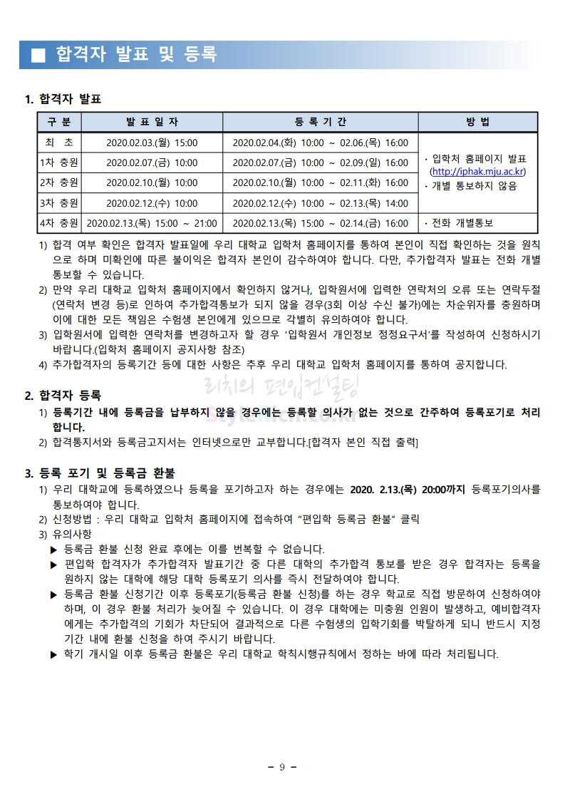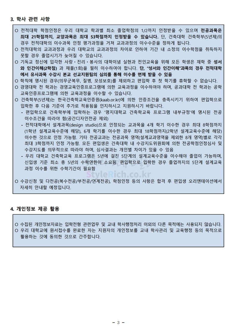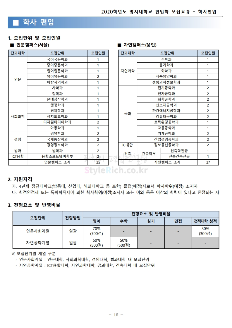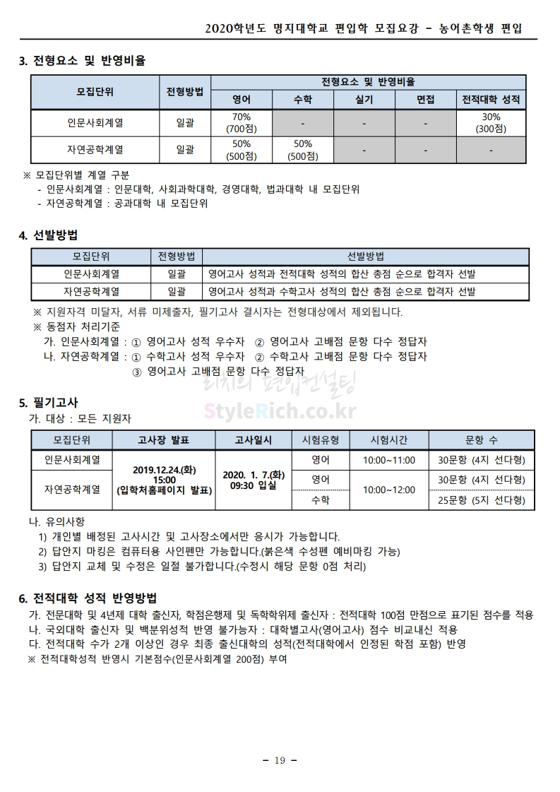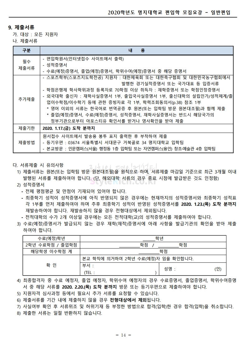 명지대 편입 2020학년도 모집요강 간편하게 보자 2019.12.05 02:53 편입 모집요강/2020학년도 모집요강 2020학년도 명지대 편입 모집요강 간편하게 확인하세요.PC와 모바일 모두에서 이미지를 클릭(터치) 후 이미지의 좌우측을 각각 클릭하면 모집요강 순서를 앞뒤로 넘길 수 있습니다. 좌측 클릭(터치)는 이전 페이지, 우측 클릭(터치)는 다음 페이지입니다. * 최종 모집요강 발표 후에도 일부 내용이 변경될 수 있으니 지원 전 반드시 명지대 입학처의 모집요강을 확인하시기 바랍니다. 2020학년도 명지대 편입 모집요강 다운받기 명지대학교_2020학년도_편입학_모집요강_홈페이지 공지.pdf 0.83MB <출처: 명지대 홈페이지> [명지투데이] 외국인 재학생과 함께하는 ‘세계음식축제’ 공유하기 게시글 관리 리치의 편입컨설팅 저작자표시 비영리 변경금지 (새창열림) '편입 모집요강 > 2020학년도 모집요강' 카테고리의 다른 글 숙명여대 편입 2020학년도 모집요강 간편하게 보자 (0) 2019.12.07 이화여대 편입 2020학년도 모집요강 간편하게 보자 (0) 2019.12.06 강남대 편입 2020학년도 모집요강 간편하게 보자 (0) 2019.12.05 경기대 편입 2020학년도 모집요강 간편하게 보자 (0) 2019.12.03 단국대(천안) 편입 2020학년도 모집요강 간편하게 보자 (0) 2019.12.01 댓글 공유하기 다른 글 댓글 이 글 공유하기 구독하기 구독하기 카카오톡 카카오톡 라인 라인 트위터 트위터 Facebook Facebook 카카오스토리 카카오스토리 밴드 밴드 네이버 블로그 네이버 블로그 Pocket Pocket Evernote Evernote 다른 글 숙명여대 편입 2020학년도 모집요강 간편하게 보자 숙명여대 편입 2020학년도 모집요강 간편하게 보자 2019.12.07 이화여대 편입 2020학년도 모집요강 간편하게 보자 이화여대 편입 2020학년도 모집요강 간편하게 보자 2019.12.06 강남대 편입 2020학년도 모집요강 간편하게 보자 강남대 편입 2020학년도 모집요강 간편하게 보자 2019.12.05 경기대 편입 2020학년도 모집요강 간편하게 보자 경기대 편입 2020학년도 모집요강 간편하게 보자 2019.12.03 다른 글 더 둘러보기