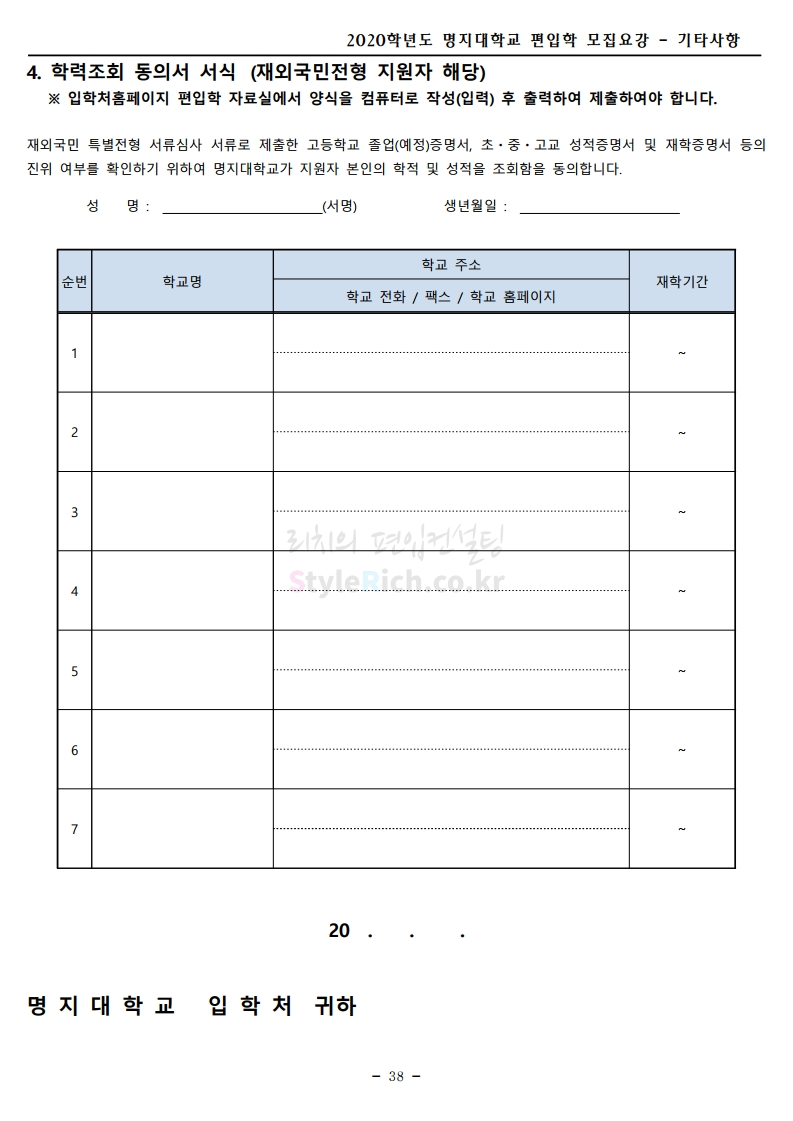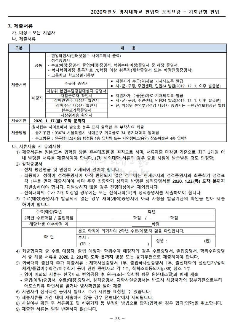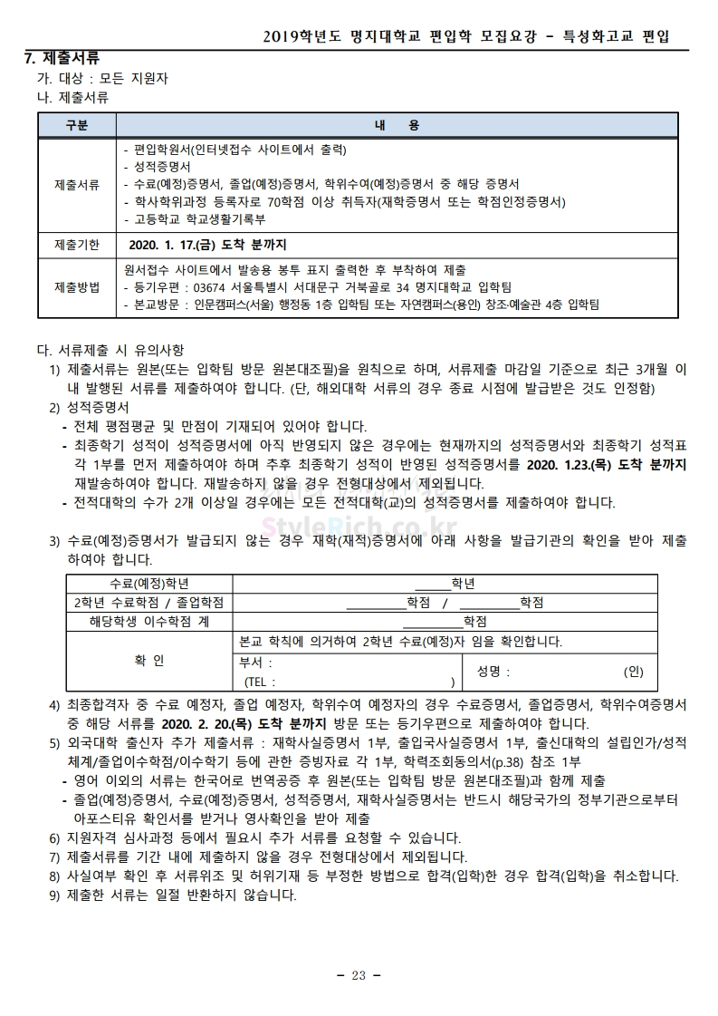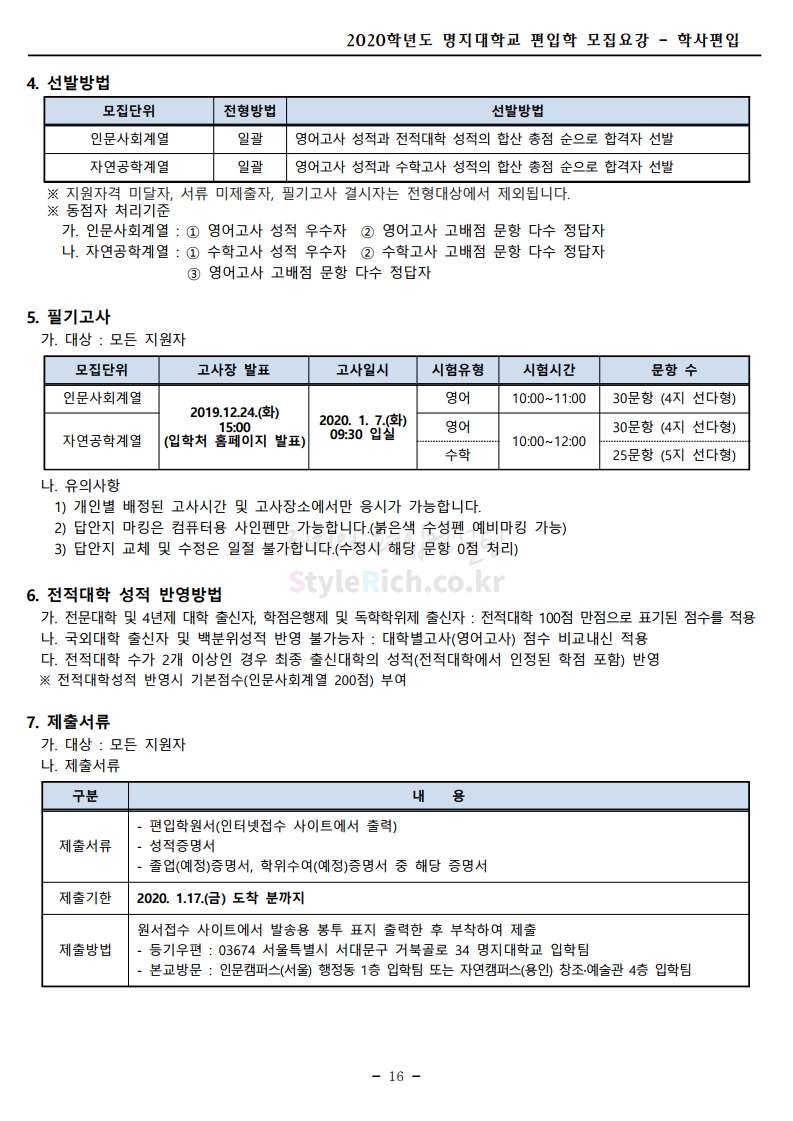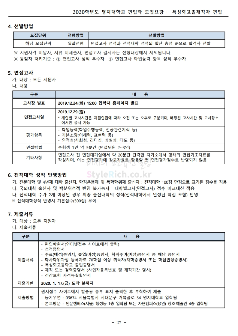명지대 편입 2020학년도 모집요강 간편하게 보자 2019.12.05 02:53 편입 모집요강/2020학년도 모집요강 2020학년도 명지대 편입 모집요강 간편하게 확인하세요.PC와 모바일 모두에서 이미지를 클릭(터치) 후 이미지의 좌우측을 각각 클릭하면 모집요강 순서를 앞뒤로 넘길 수 있습니다. 좌측 클릭(터치)는 이전 페이지, 우측 클릭(터치)는 다음 페이지입니다. * 최종 모집요강 발표 후에도 일부 내용이 변경될 수 있으니 지원 전 반드시 명지대 입학처의 모집요강을 확인하시기 바랍니다. 2020학년도 명지대 편입 모집요강 다운받기 명지대학교_2020학년도_편입학_모집요강_홈페이지 공지.pdf 0.83MB <출처: 명지대 홈페이지> [명지투데이] 외국인 재학생과 함께하는 ‘세계음식축제’ 공유하기 게시글 관리 리치의 편입컨설팅 저작자표시 비영리 변경금지 (새창열림) '편입 모집요강 > 2020학년도 모집요강' 카테고리의 다른 글 숙명여대 편입 2020학년도 모집요강 간편하게 보자 (0) 2019.12.07 이화여대 편입 2020학년도 모집요강 간편하게 보자 (0) 2019.12.06 강남대 편입 2020학년도 모집요강 간편하게 보자 (0) 2019.12.05 경기대 편입 2020학년도 모집요강 간편하게 보자 (0) 2019.12.03 단국대(천안) 편입 2020학년도 모집요강 간편하게 보자 (0) 2019.12.01 댓글 공유하기 다른 글 댓글 이 글 공유하기 구독하기 구독하기 카카오톡 카카오톡 라인 라인 트위터 트위터 Facebook Facebook 카카오스토리 카카오스토리 밴드 밴드 네이버 블로그 네이버 블로그 Pocket Pocket Evernote Evernote 다른 글 숙명여대 편입 2020학년도 모집요강 간편하게 보자 숙명여대 편입 2020학년도 모집요강 간편하게 보자 2019.12.07 이화여대 편입 2020학년도 모집요강 간편하게 보자 이화여대 편입 2020학년도 모집요강 간편하게 보자 2019.12.06 강남대 편입 2020학년도 모집요강 간편하게 보자 강남대 편입 2020학년도 모집요강 간편하게 보자 2019.12.05 경기대 편입 2020학년도 모집요강 간편하게 보자 경기대 편입 2020학년도 모집요강 간편하게 보자 2019.12.03 다른 글 더 둘러보기