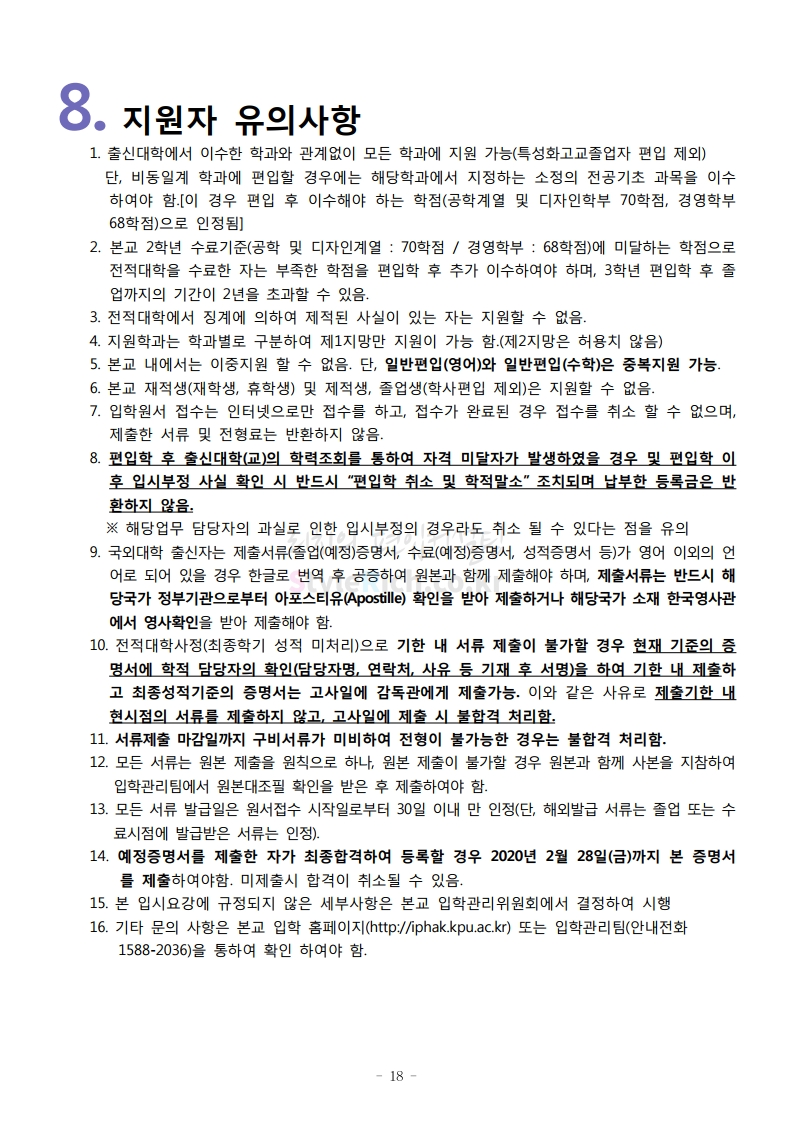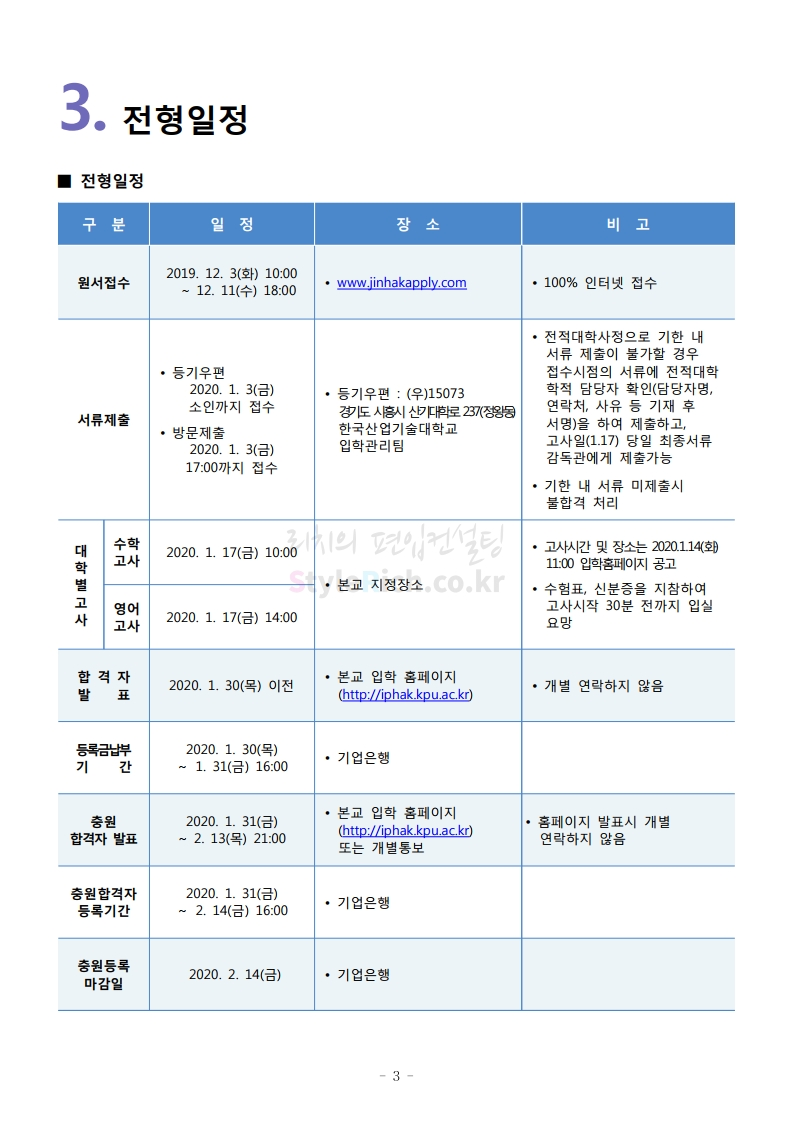 한국산업기술대 편입 2020학년도 모집요강 간편하게 보자 2019.12.07 01:58 편입 모집요강/2020학년도 모집요강 2020학년도 한국산업기술대 편입 모집요강을 간편하게 확인하세요. PC와 모바일 모두에서 이미지를 클릭(터치) 후 이미지의 좌우측을 각각 클릭하면 모집요강 순서를 앞뒤로 넘길 수 있습니다. 좌측 클릭(터치)는 이전 페이지, 우측 클릭(터치)는 다음 페이지입니다. * 최종 모집요강 발표 후에도 일부 내용이 변경될 수 있으니 지원 전 반드시 한국산업기술대 입학처의 모집요강을 확인하시기 바랍니다. 2020학년도 한국산업기술대 편입 모집요강 다운받기 한국산업기술대학교-2020학년도 편입생 모집 요강.pdf 0.35MB <출처: 한국산업기술대 홈페이지> 공유하기 게시글 관리 리치의 편입컨설팅 저작자표시 비영리 변경금지 (새창열림) '편입 모집요강 > 2020학년도 모집요강' 카테고리의 다른 글 수원대 편입 2020학년도 모집요강 간편하게 보자 (0) 2019.12.07 연세대(미래) 편입 2020학년도 모집요강 간편하게 보자 (0) 2019.12.07 숙명여대 편입 2020학년도 모집요강 간편하게 보자 (0) 2019.12.07 이화여대 편입 2020학년도 모집요강 간편하게 보자 (0) 2019.12.06 명지대 편입 2020학년도 모집요강 간편하게 보자 (0) 2019.12.05 댓글 공유하기 다른 글 댓글 이 글 공유하기 구독하기 구독하기 카카오톡 카카오톡 라인 라인 트위터 트위터 Facebook Facebook 카카오스토리 카카오스토리 밴드 밴드 네이버 블로그 네이버 블로그 Pocket Pocket Evernote Evernote 다른 글 수원대 편입 2020학년도 모집요강 간편하게 보자 수원대 편입 2020학년도 모집요강 간편하게 보자 2019.12.07 연세대(미래) 편입 2020학년도 모집요강 간편하게 보자 연세대(미래) 편입 2020학년도 모집요강 간편하게 보자 2019.12.07 숙명여대 편입 2020학년도 모집요강 간편하게 보자 숙명여대 편입 2020학년도 모집요강 간편하게 보자 2019.12.07 이화여대 편입 2020학년도 모집요강 간편하게 보자 이화여대 편입 2020학년도 모집요강 간편하게 보자 2019.12.06 다른 글 더 둘러보기